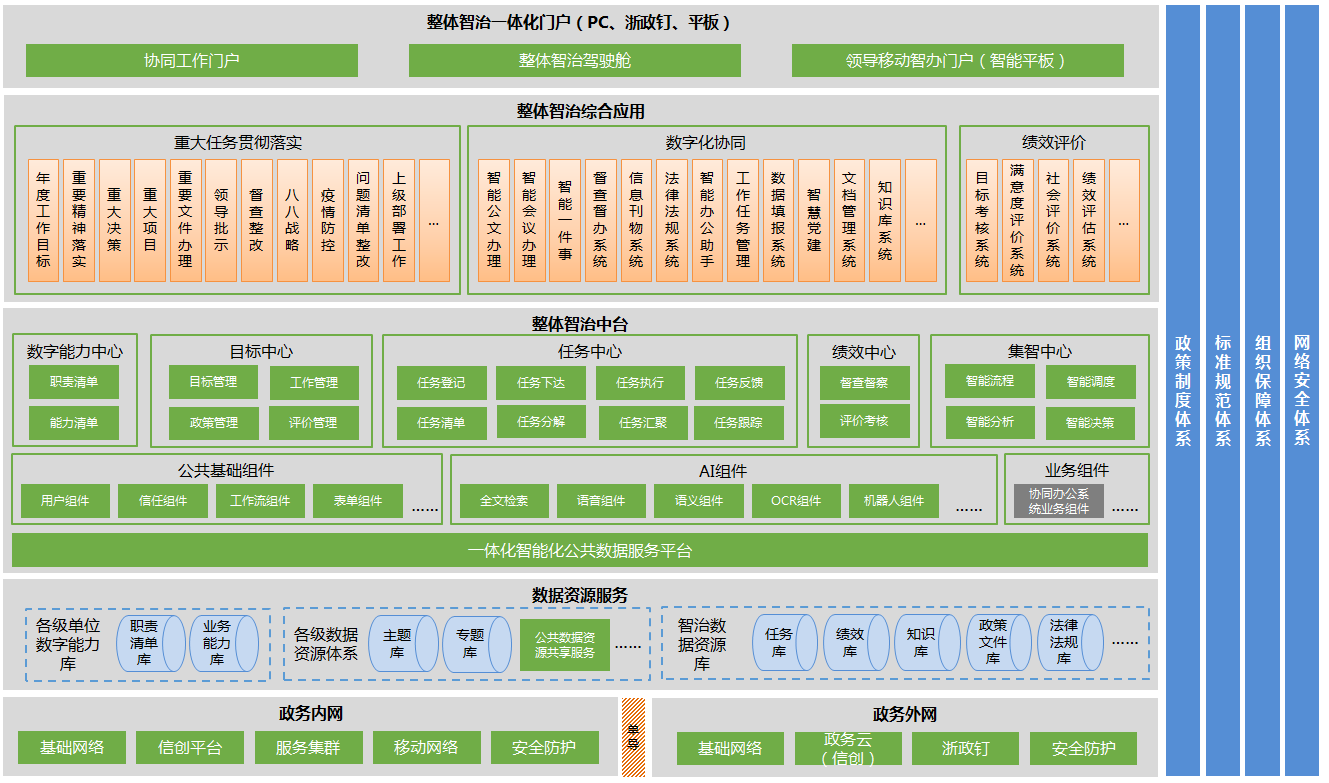 按照“四横四纵”架构,依托政务内网、外网基础设施和公共基础支撑服务,建设全局掌控、政令智达的整体智治中台;并以此为支撑,集成和构建一批具有本地特色的重大任务场景化应用;同时整合提升协同办公系统,建立高效协同机制;强化跟踪监督和绩效,形成闭环管理;采用多端融合机制和移动互联网技术,使用浙政钉和移动平板载体,为各类用户和各级领导提供掌上办公办事一体化门户。